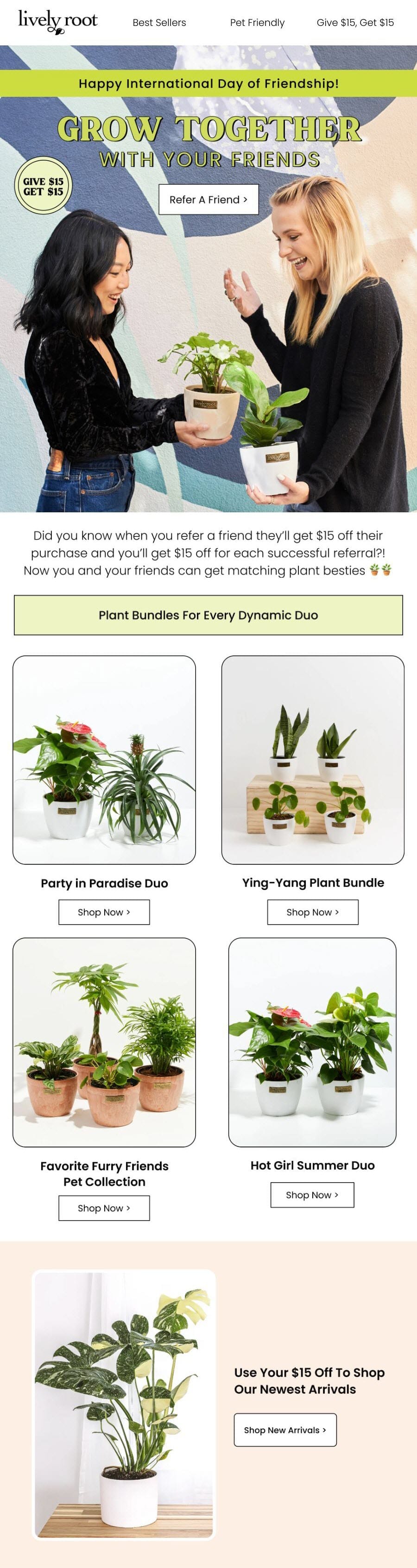 - Referral email: Run a referral campaign, inviting customers to invite their friends to enjoy an exclusive discount offer just for them.