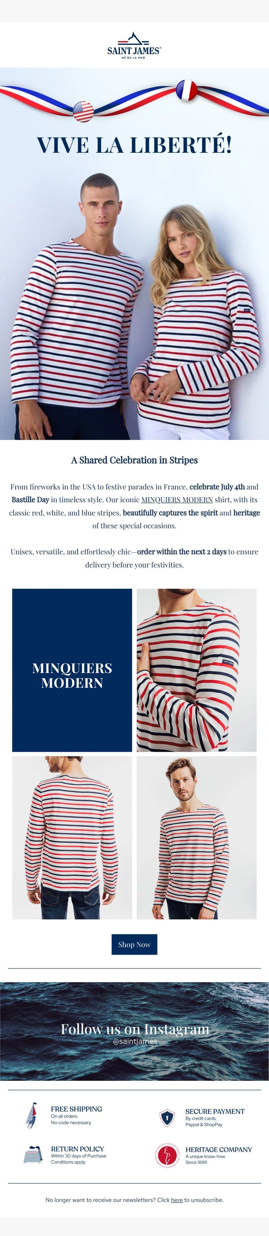 - Story-driven: Offer your subscribers a glimpse of what a French celebration is like. Highlight Bastille Day traditions, what to eat, or how to celebrate from afar. Pair it with a subtle product recommendation.